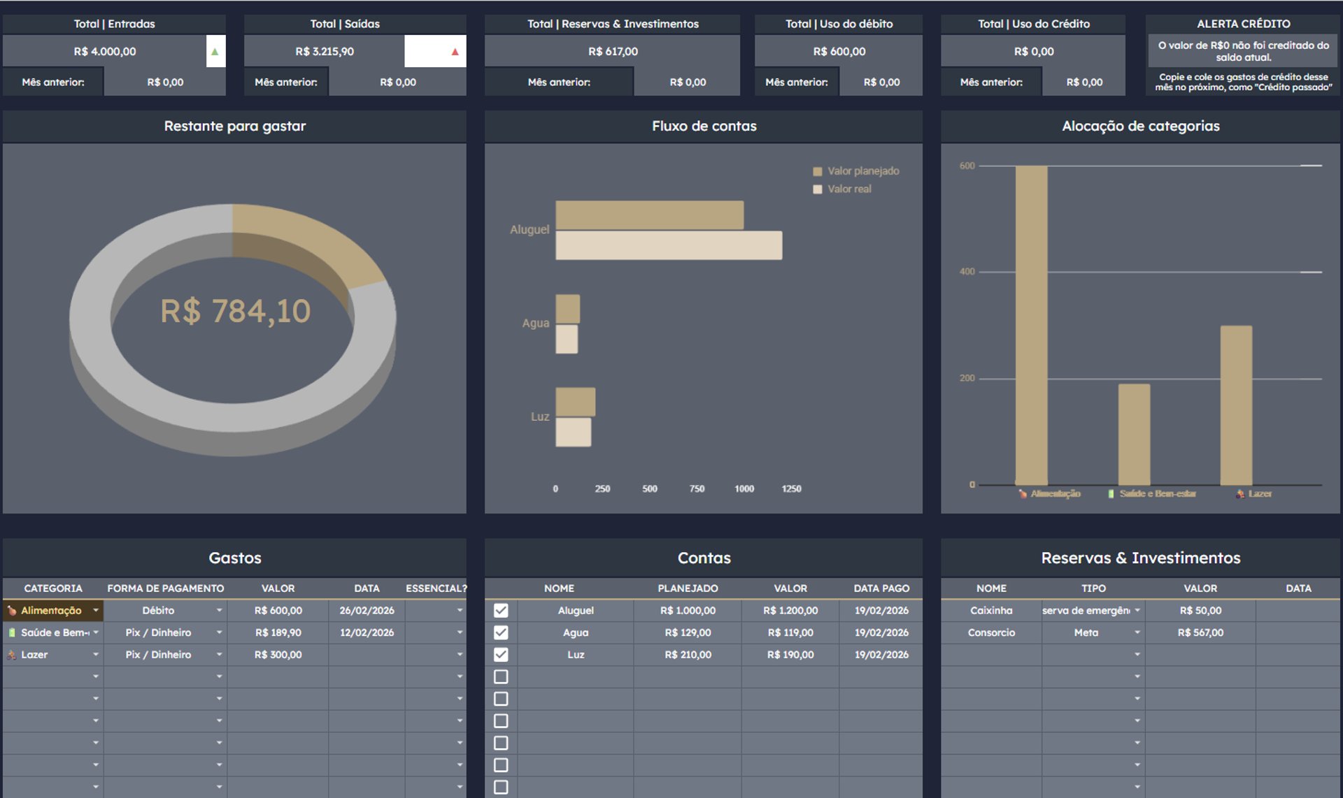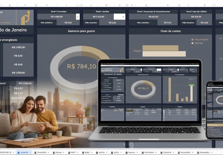 Organize seu dinheiro de forma simples e visual, mesmo que você nunca tenha conseguido manter uma planilha antes.